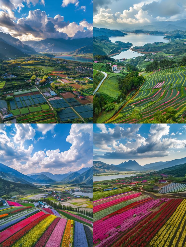 Midjourney Bot 更新时间:2024-03-01 00:01Aerial photography, beautiful sky, clouds, and a broad view of flower fields. Peony, rose, tulip, vanilla, exotic flower, Xifu Begonia, wind chime grass and other colorful blooms, complementing the beautiful colors in the distance. Between the beautiful colors and flowers, there is a beautiful scenery of green mountains, small houses, and blue lakes. Looking up, the sky is filled with huge colorful clouds, and the morning glow reflects all of this, making the entire picture full of romance and beauty. --ar 3:4 --v 6.0