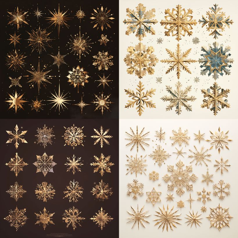 Midjourney Bot 更新时间:2024-03-01 00:02Orderly arrangement of metal snowflakes, golden snowflakes --ar 1:1 --niji 6