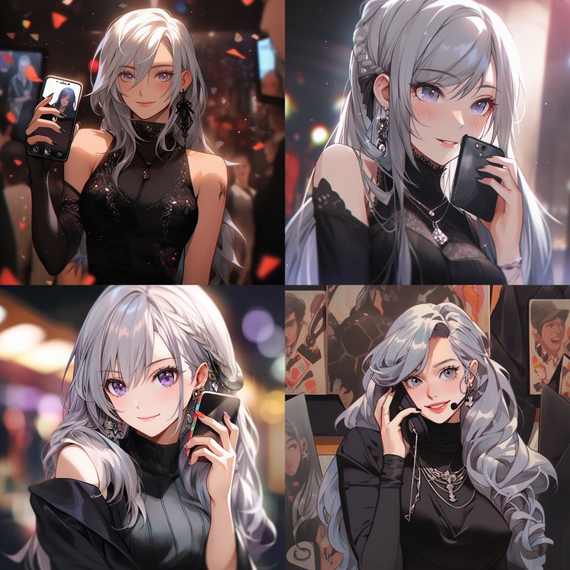Midjourney Bot 更新时间:2024-03-01 00:030038, _8K, a thirty year old silver haired beauty with a phone in her ear, a smiling expression, black Bodycon skin, exquisite makeup, KTV background, perfect details --ar 1:1 --niji 5