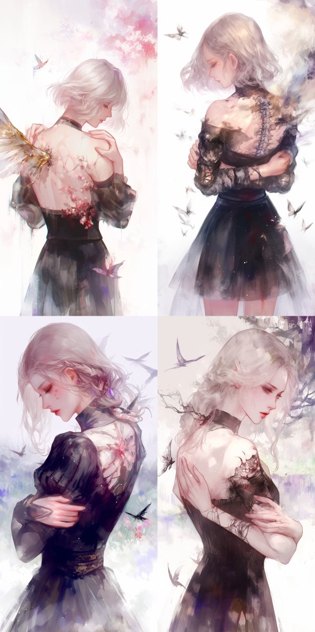 Midjourney Bot 更新时间:2024-02-25 00:11A white haired girl with her back facing the camera, her hands crossed and hugging her shoulders. The butterfly bone on her back was injured by the broken wings --sref