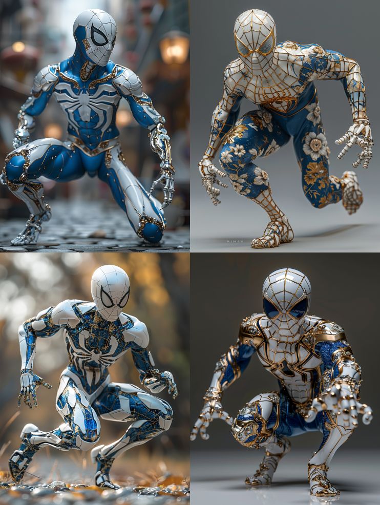 Midjourney Bot 更新时间:2024-02-25 00:14Running Spider Man in a miniature blue and white porcelain color, with golden mirrored edges, gemstones, human skeleton, high detail, realistic, 16K, chrome plated, and vray tracking --s 614 --ar 3:4 --v 6.0