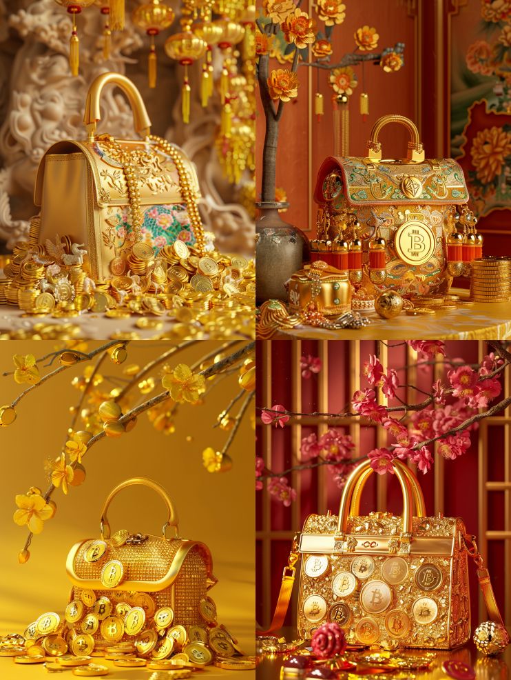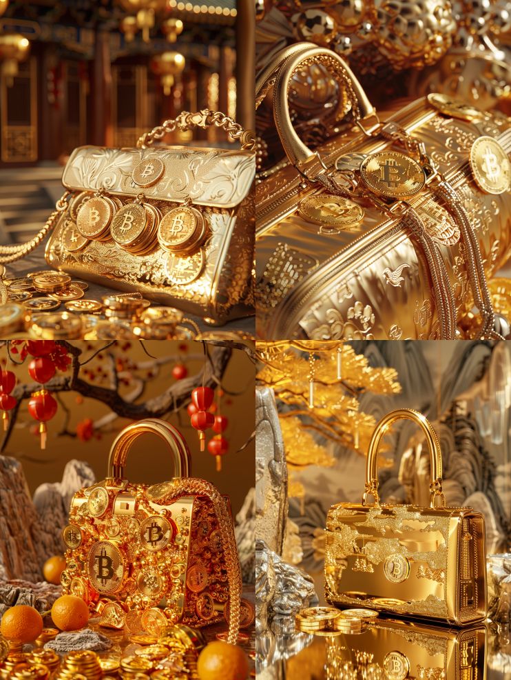 Midjourney Bot 更新时间:2024-02-23 00:15Open minimalist and innovative fashion bag, many gold mirror gold coins and bitcoins, international gold weighing 50g gold bars, gold and silver jewelry and jade ware, high reflection, bright gold, Chinese classical style, product photography, commercial photography, 12 noon, chrome, luxurious texture, 16K, C4D, OC --s 202 --ar 3:4 --v 6.0