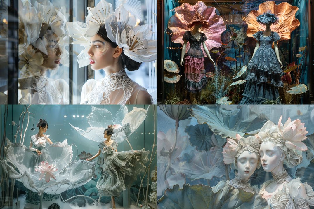 Midjourney Bot 更新时间:2024-02-23 00:12Two women in parallel time and space, changing roles in the showcase. Women's clothing, showcase art, decoration, and window display. Lotus flowers with lace edges and lotus leaves with lace edges are noble, luxurious, fashionable, three-dimensional, and realistic --ar 3:2 --v 6.0