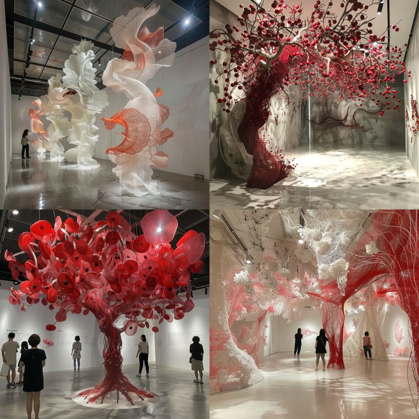 Midjourney Bot 更新时间:2024-02-23 00:16Public art installation, three meters high and one meter wide, in an exhibition room, made of wire, plastic, fabric, and porcelain, with lychee elements, expressing Guangzhou lychee culture. It has a streamlined form, irregular shape, surrealism, and can be touched by people --ar 1:1 --v 6.0