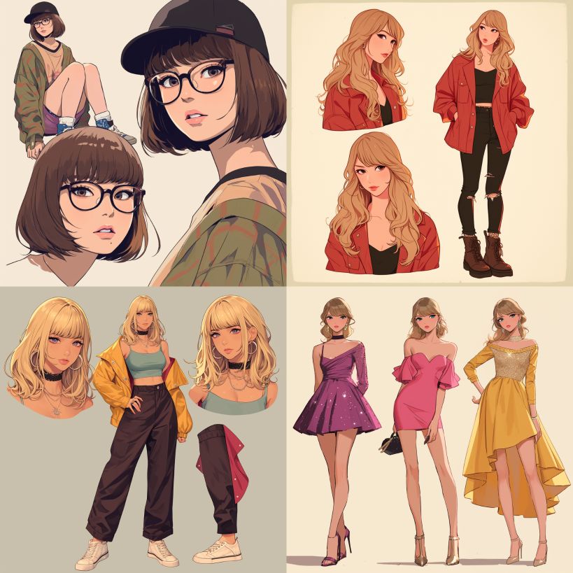 Midjourney Bot 更新时间:2024-02-17 00:18Character design, the female protagonist is a celebrity who looks like Taylor Swift, with three views and a live action illustration style. --ar 1:1 --niji 6