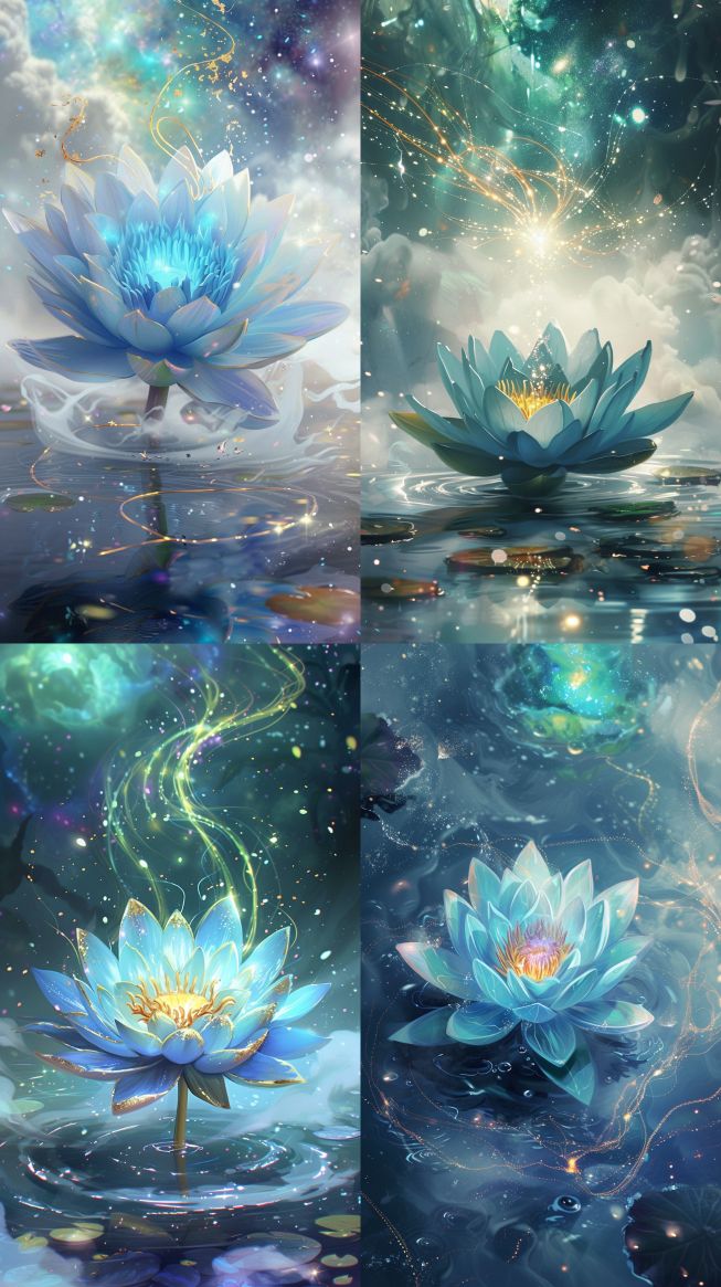 Midjourney Bot 更新时间:2024-02-09 00:03On the white water surface, amidst the white smoke, floats a dreamy blue lotus flower. The petals of the lotus flower have bright golden edges on the flower path, and there are bright golden colorful energy coils dancing above the lotus flower. The sparkling style, anime aesthetics, soft radiance, bright colors, complex and mysterious background. In the distance, there is a cosmic galaxy, green purple, sparkling, and millennium insect aesthetics --ar 9:16 --v 6.0