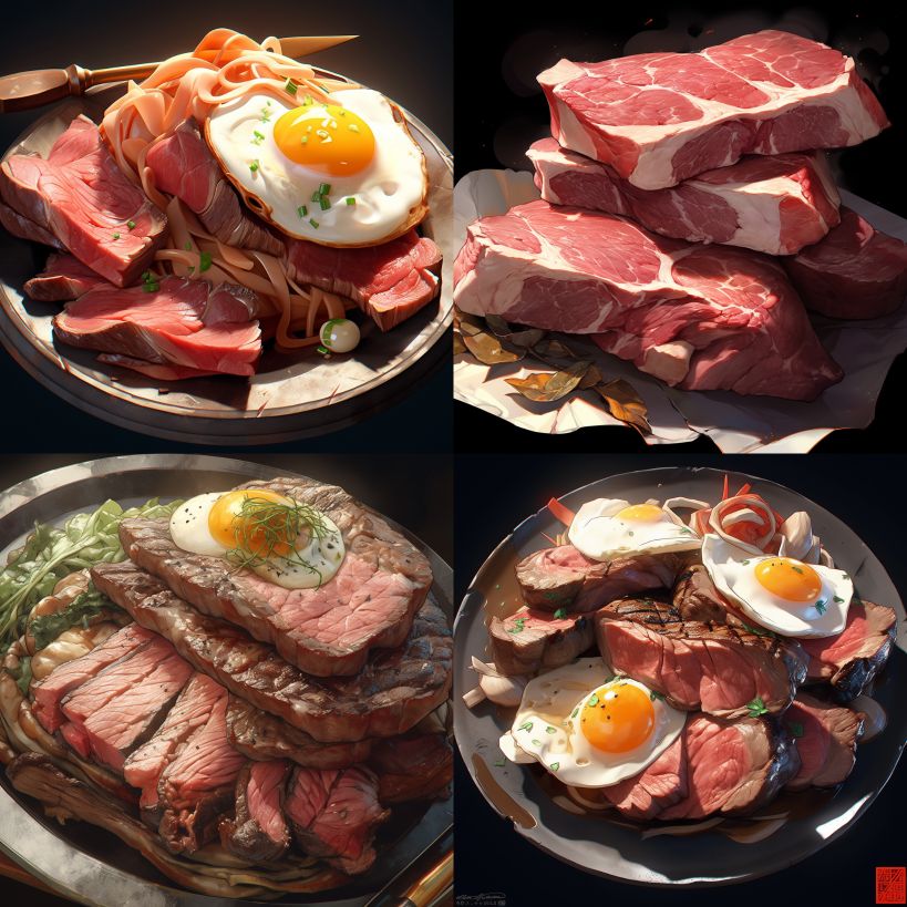 Midjourney Bot 更新时间:2024-02-08 00:09Steak contains egg pasta, digital painting, Chinese art style, ultra fine, complex, master, perfect technique, Chinese classic, 3D shading, high detail, ultra high quality, 16k. --ar 1:1 --style expressive --niji 5