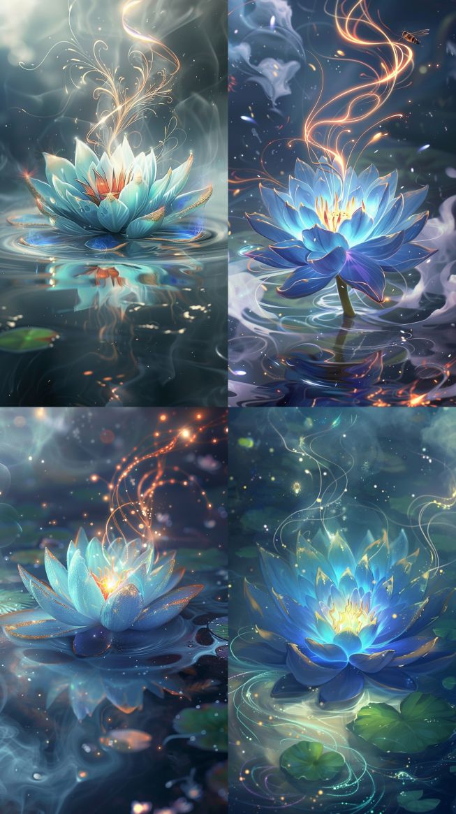 Midjourney Bot 更新时间:2024-02-09 00:00On the white water surface, amidst the white smoke, floats a dreamy blue lotus flower. The petals of the lotus flower have bright golden edges on the flower path, and there are bright golden seven colored glowing energy coils dancing above the lotus flower. The sparkling style, anime aesthetics, soft luminescence, bright colors, complex and mysterious background, green purple, sparkling, millennium insect aesthetics --ar 9:16 --v 6.0
