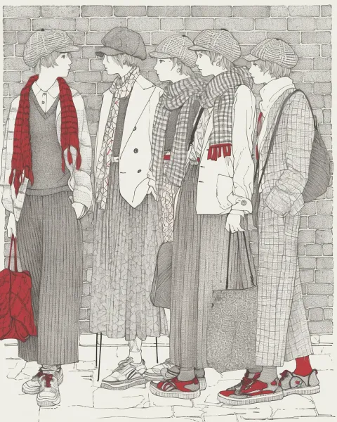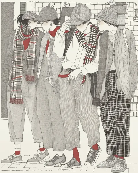 Midjourney Bot 更新时间:2026-03-31 00:16黑白钢笔画速写,时尚街拍主题,多个年轻人的日常穿搭群像,宽松复古外套、格纹围巾、条纹阔腿裤、运动鞋、针织帽,人物动态自然,背景是写实砖墙街道,用密集细腻的线条表现衣物纹理和环境质感,仅用红色作为点缀色,干净的纯白背景,日式速写风格,服装细节刻画丰富,线条流畅干净,高级的黑白灰层次,插画师的手绘 --ar 4:5 --style raw --stylize 100 --niji 6 --sref https://images.gogpt.vip/aigf/m_origin/20260330/1824779/pex1uar82yogiatg.jpg --sw 468