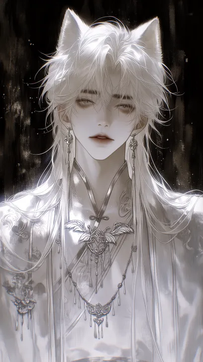 Midjourney Bot 更新时间:2026-03-31 00:16轻盈,正面,风格慵懒奢华,全身特写,照片质感略带颗粒感,光线昏暗,男性,古老中国风格,年轻,面部特征鲜明深邃,长直白发,披散,微乱,病态,正脸,低饱和,复古高端,狐妖, 树林背景,带着戏谑,蛊惑的目光,目光游移,白狐耳朵,尾巴,脖子上戴着流苏项链,目光冷冽迷人,不露出腹肌和胸肌,白袍,圆领绣有羽毛和吉祥云朵, 皮肤质地清晰,白皙,半身距离,近身半厚画风,正脸,慵懒奢华风格,全身特写,画面带点颗粒感,柔光,发丝边缘光,超精细发丝,画面颜色灰白色,复古高端,8高清 --ar 9:16 --stylize 1000 --niji 7