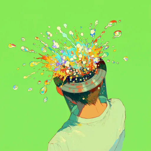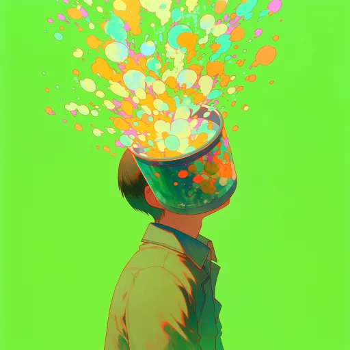 Midjourney Bot 更新时间:2026-03-31 00:24荧光薄荷绿背景,头像,人物的头是一个圆柱形罐头,喷有潮流彩绘,大量的气泡从罐头里喷出,头向后仰,撞色,潮流抽象艺术,清新感,鲜艳色彩 --ar 1:1 --stylize 100 --niji 7