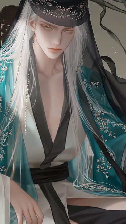 Midjourney Bot 更新时间:2026-03-31 00:19一个动漫俊美男子,白色长发,乌沙幞头,beads fringe+threads fringe,穿着湖蓝色和珠光白色的刺绣花纹 曲裾深衣 八幅裙,只露出一条腿,身上裹着丝绸,坐在椅子上,近距离 --ar 9:16 --style raw --stylize 100 --niji 6 --no no