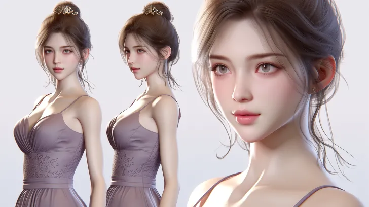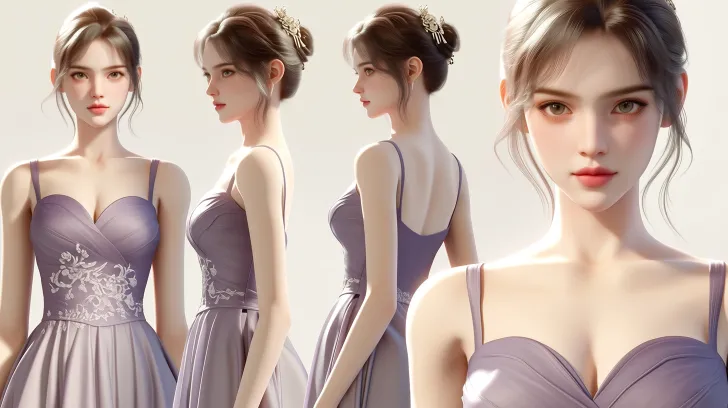 Midjourney Bot 更新时间:2026-03-31 00:20国漫超写实3D建模风格,CG游戏建模,虚幻引擎5渲染,正面视角 约25岁的中国女性,皮肤白皙细腻,绝世美女,眉眼温婉中带着精明,嘴角常带一丝似笑非笑。身着一袭淡紫色锦裙,裙摆绣着精致暗纹,贴身剪裁勾勒出凹凸有致的身材。发髻高挽,插着玉簪,如十八少女。 身材与身姿 (Figure & Posture): 体态: 身材高挑,体态优美(Tall stature, elegant posture)。 比例: 身体比例匀称且完美(Perfectly proportioned body)。 具体描述: 具有非常明显的丰满身材 (well-endowed figure),特写镜头(右侧)可以清晰地看到其丰满的胸部轮廓 (full bustline) 和深邃的乳沟 (defined cleavage)。锁骨清晰可见,上身线条优美、女性化。同时,手臂纤细修长(slender arms)。 [构图标签:人物三视图,正面全身,侧面全身,背面全身,面部特写,横向排列在一张图片上,背景纯白]。[摄影风格:采用中画幅胶片级人像摄影风格,模拟自然光下的人文肖像。光线以柔和的窗户光为主,形成自然的明暗过渡,高光不过曝,暗部保留细节。镜头语言:使用85mm焦段,光圈f/1.8,浅景深背景虚化,焦外散景呈现自然的圆形光斑,无数字感。焦点严格锁定在靠近镜头的眼睛上,睫毛与虹膜纹理清晰可辨。质感与真实感:皮肤保留真实肌理、细微毛孔与自然肤色,淡紫色锦裙的丝绸质感与暗纹刺绣,玉簪的温润玉质光泽,发丝的层次与光泽。色调与氛围:整体色调为暖中带灰的胶片感,室内晨光形成柔和的暖色调,肤色呈现透光的暖白调,高光微暖,阴影偏中性灰,画面沉稳不轻浮。氛围雍容、精明、温婉中带着洞察力。画质要求:8k超高清,raw风格导出,细节无损,无任何水印、边框或数字噪点。] --ar 16:9 --stylize 100 --niji 7