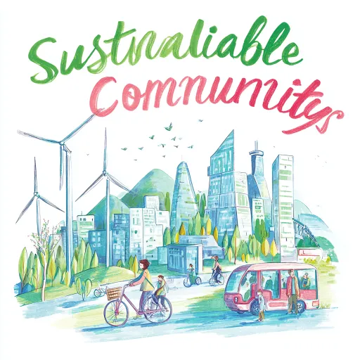 Midjourney Bot 更新时间:2026-03-31 00:23A4竖版扁平清新风插画,主题为联合国可持续城市和社区。里面要有人物插画配合整体画面,凸显可持续城市和社区的场景。背景是现代城市建筑,点缀风力发电机、新能源电车、共享自行车,远处是浅绿山峦和渐变蓝天,点缀飞鸟。低饱和度马卡龙配色,线条干净,无复杂阴影,整体明亮治愈,顶部手写圆润字体「可持续城市」,底部「绿色社区」。 --ar 1:1 --v 7 --stylize 100