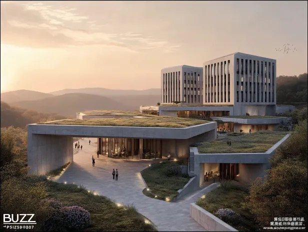 Midjourney Bot 更新时间:2026-03-31 00:24https://images.gogpt.vip/aigf/m_origin/20260330/2110200/2dnzm93i0133f55e.jpg 参考直向建筑事务所,全直线条无任何曲线,大型建筑嵌入场地景观,如同从大地自然生长而出,基底坚实稳固,完全无漂浮感、悬空感,自上而下的鸟瞰视角,极简纯粹的材质表达,清水混凝土细腻自然的肌理,建筑与自然环境和谐对话,柔和自然的天光,清晰的空间层级关系,超写实建筑效果图,8K超高精度, --ar 4:3 --v 7 --c 3 --stylize 294 --iw 2 --no 曲线建筑