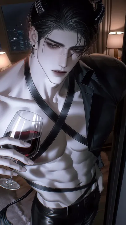 Midjourney Bot 更新时间:2026-04-01 00:01https://images.gogpt.vip/aigf/m_origin/20260327/2091292/qsze92pjz4v5pji4.jpg https://images.gogpt.vip/aigf/m_origin/20260331/2091292/fyubrya7fzhloy4a.jpg https://images.gogpt.vip/aigf/m_origin/20260331/2091292/cbm4khdvkxapohkm.jpg https://images.gogpt.vip/aigf/m_origin/20260331/2091292/vsiplk1006xf87k8.jpg https://images.gogpt.vip/aigf/m_origin/20260327/2091292/jkty7yzqvp6f09nc.jpg 俯视视角,全身构图,熟男恶魔站在宽敞的卧室中央,精致五官立体生动,高挺鼻梁,眉骨高耸,灰色眼眸半垂看向镜头,眼神迷离冷淡带着一丝若有若无的挑逗,睫毛浓密,眼尾微红,薄唇微抿嘴角微微下压,五官有自然淡妆感,轮廓线条锋利,冷白皮在暖色灯光下泛着柔和的暖调光泽。黑色三七分短发利落有型,发丝刻画细节有层次,根根分明有粗细变化,刘海微微散落额前,发尾自然翘起,暖光下每缕发丝都有柔和高光过渡。头顶一对黑色恶魔角弯曲向上,角尖锋利,角身有细腻纹理。 上半身仅由几根黑色皮质绑带交错缠绕,绑带细细勒进肌肤,从肩头斜跨过胸肌,在胸口交叉后绕向腰侧,胸肌被绑带勾勒出饱满弧度,绑带边缘勒出浅浅痕迹,腹肌沟壑在绑带间隙分明,腰侧绑带收束出紧实腰线。下身穿着黑色皮质短裤,裤边收在大腿中段,皮质面料紧贴肌肤,大腿肌肉线条饱满紧实。身后一条细长恶魔尾巴自然垂落,尾端呈爱心形状。一只手端着红酒杯,杯身倾斜酒液微晃,手指修长骨节分明,另一只手随意搭在腰侧绑带边缘。 背景是宽敞卧室,暖色台灯在床头散发出柔和光晕,落地窗透进城市夜景与室内暖光交融,地面深色绒毯吸收光线,整体氛围温暖暧昧。全身俯视构图,人物站在画面中央,暖色灯光在胸肌和绑带上形成柔和光影,半厚涂质感,迷离感与熟男禁欲气质交织。精致五官,细节刻画层次丰富,五官有妆感,自然淡淡的,熟男,精致五官,细节刻画立体生动,朦胧感微微的模糊感,立体五官高挺鼻梁,全图半厚涂细节刻画,不要过于真实,迷离感,发丝刻画细节有层次,温暖感 --ar 9:16 --seed 369746048 --iw 2 --niji 7 --no 过多的手指,锥子脸,发光眼,错误的手,多余的手,过长的脸,太长的下巴