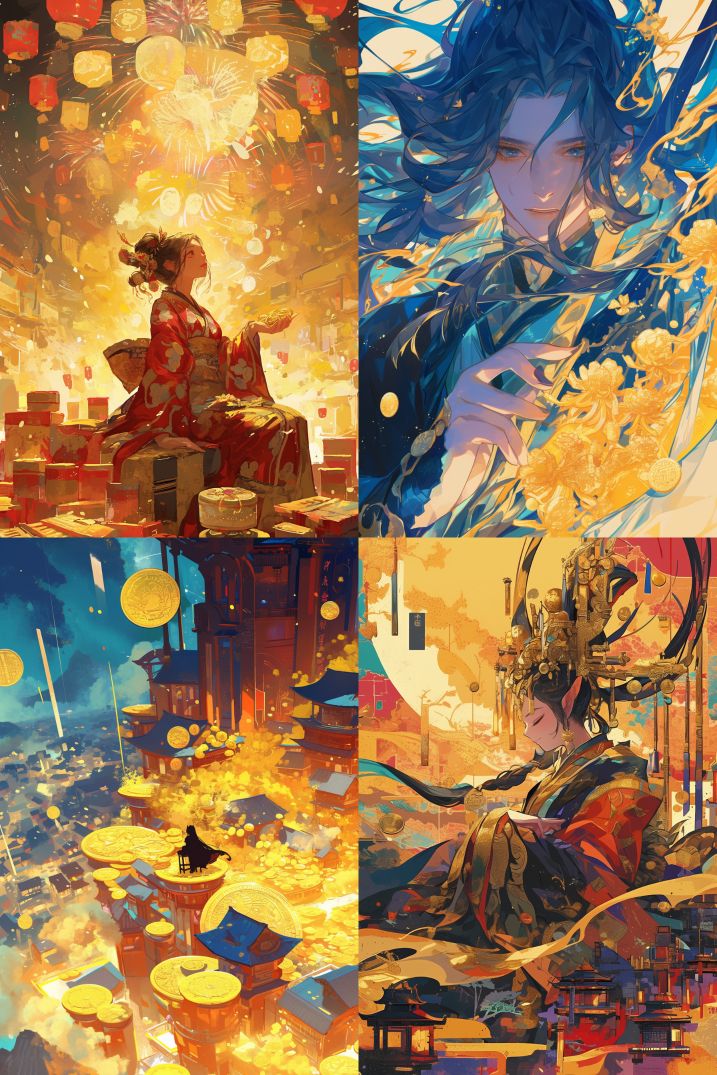 Midjourney Bot 更新时间:2024-02-05 00:08Many gold coins, bold color blocks, background with blooming fireworks, fantasy nights, and a new Chinese style painting style --ar 2:3 --niji 6