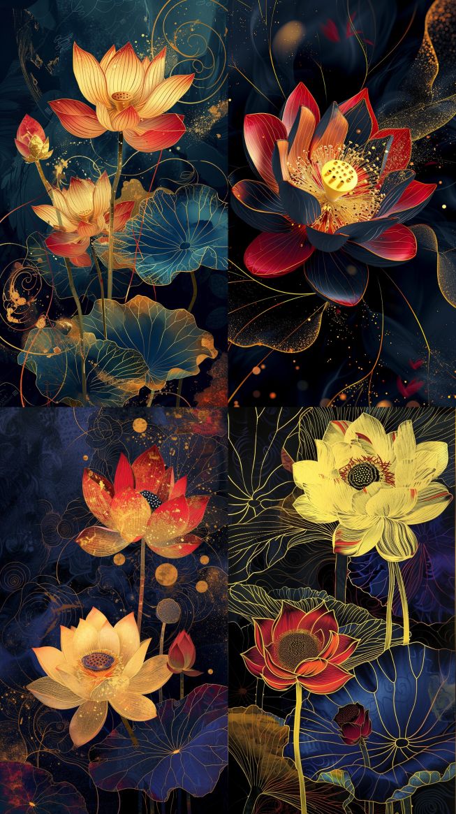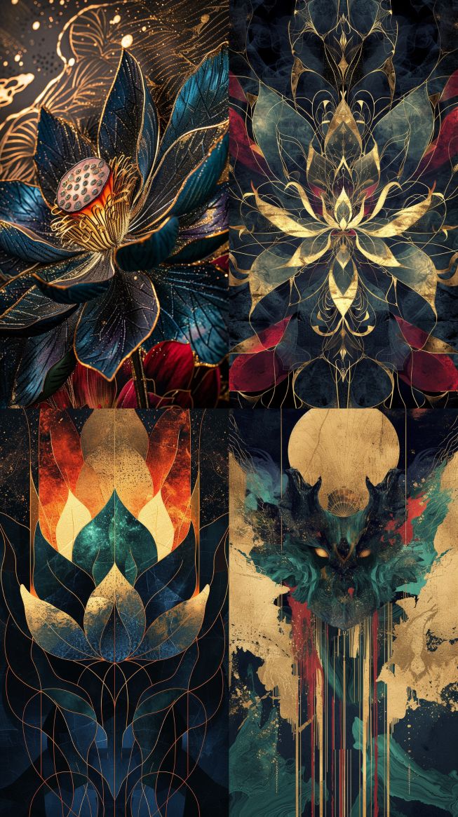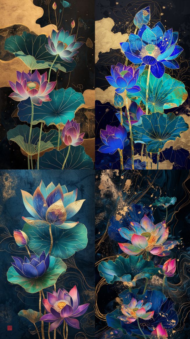 Midjourney Bot 更新时间:2024-01-30 00:07The blue, green, and purple lotus flowers face the viewer, with deep black and bright gold powder complementing elegant gold, presenting a mysterious and noble atmosphere. Style: The combination of modern technological aesthetics and abstract art, gold foil, dark blue purple, coco red, bright gold, traditional decorative quantum dot gold thread dancing, dark blue, dark red, background with rose lines and dark patterns, textured and three-dimensional concave convex techniques, black and gold illustrations, intricate and complex lines and beautiful pattern styles, traditional Chinese lines and patterns --ar 9:16 --v 6.0