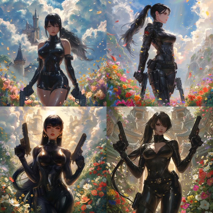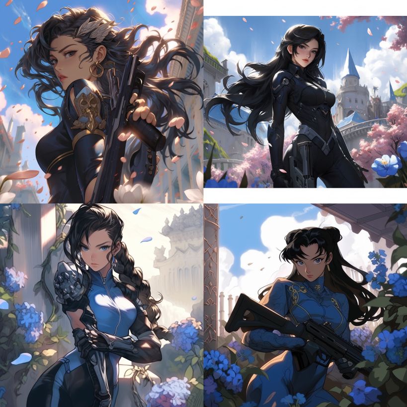 Midjourney Bot 更新时间:2024-01-29 00:11Chunli was wearing a tight black combat suit, with flowing black hair and firm eyes. She held two guns and stood in a sea of flowers, with a majestic ancient castle behind her. The sunlight shone through the clouds on her, making her look even more heroic. --ar 1:1 --niji 5