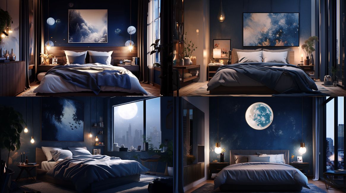 Midjourney Bot 更新时间:2024-01-16 00:02In this late night modern style bedroom, moonlight shines through the large window, casting soft shadows. There is an abstract artwork hanging on the wall, with rich and charming colors that complement the deep blue bedding. On the bedside table, there are several beautifully bound books, and a bunch of dried flowers quietly stand in the corner. The room is filled with a fresh aroma, as if it is a mysterious fragrance from an unknown garden. The entire space exudes a peaceful and elegant atmosphere, making people feel as if they are in a quiet and comfortable dream. --ar 16:9 --niji 5