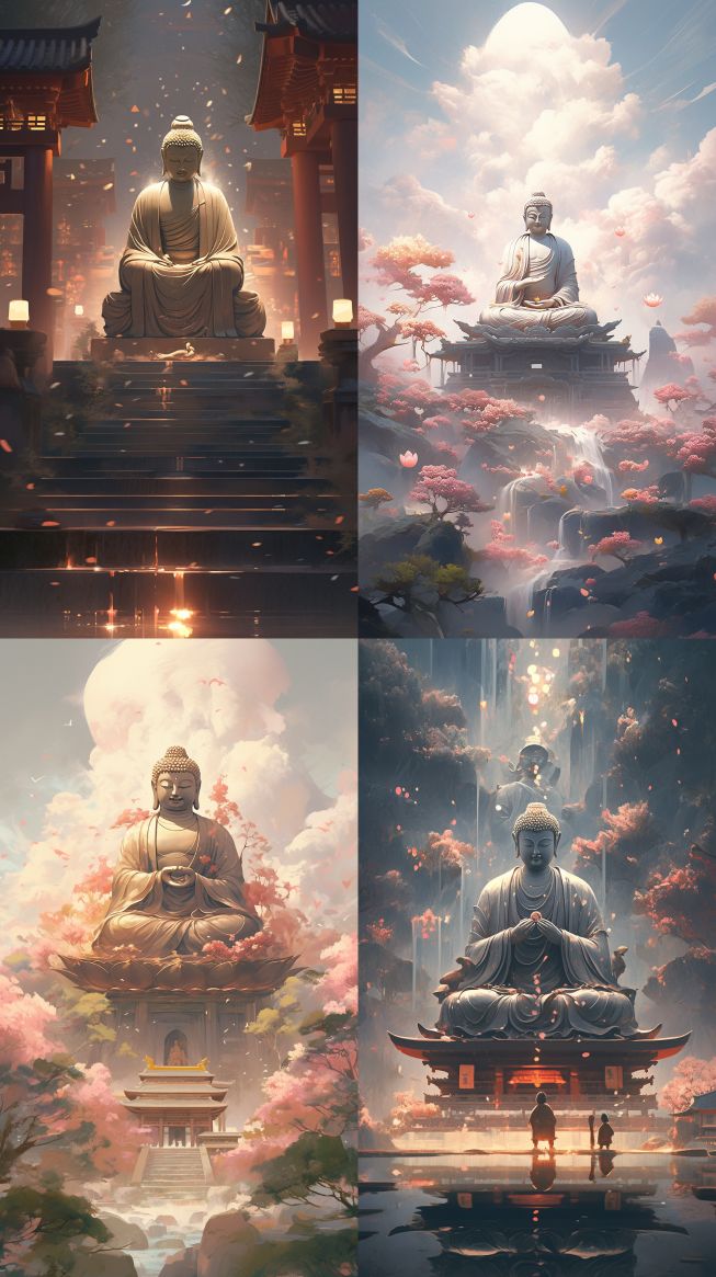 Midjourney Bot 更新时间:2024-01-08 00:15Buddha, ancient Buddha, great Buddha, classical, gentle, hazy, elegant, beautiful, artistic conception, humanistic --ar 9:16 --niji 5