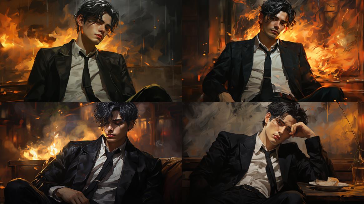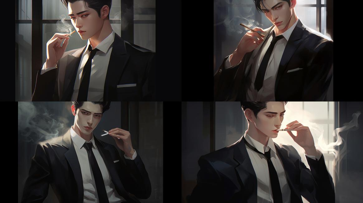 Midjourney Bot 更新时间:2023-12-22 00:04Male suit, male smoking, Korean anime, male youth anime image, contrasting portrait painting style, black romantic realism, night chip, realistic super details, --ar 16:9 --style raw --v 5.2 --s 750