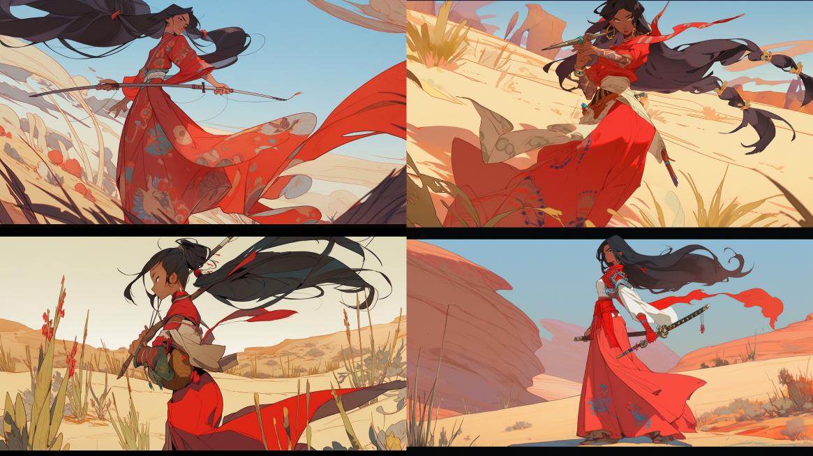 Midjourney Bot 更新时间:2023-12-20 00:07A Chinese woman dressed in red, tied in a long ponytail and holding a sword, walks in the desert, depicting national cartoons, distant views, and plants --ar 16:9 --style expressive --niji 5
