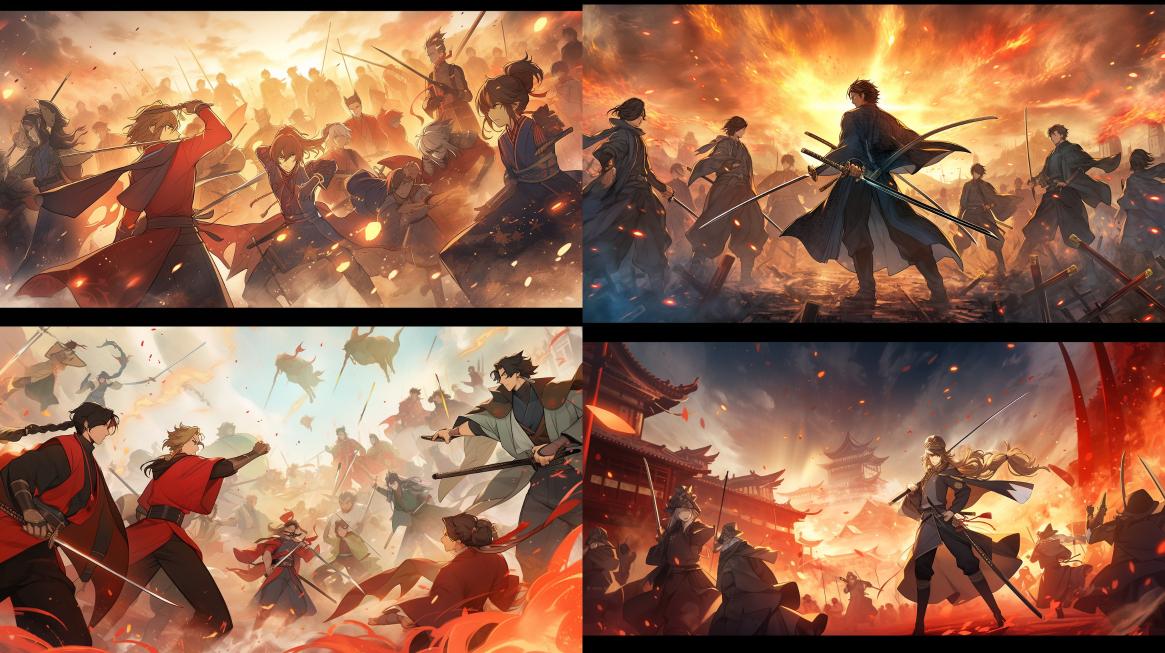 Midjourney Bot 更新时间:2023-12-20 00:07In an ancient style scene, in a battlefield filled with gunpowder, a group of people are fighting against each other, with the male and female protagonists facing each other from the back to the enemy. High quality picture quality, digital painting, Chinese painting style, super detailed, complex, master, perfect technology, gemstone decoration, Chinese classical, 3D shadows, high details, super high quality, 16k. --ar 16:9 --style cute --niji 5