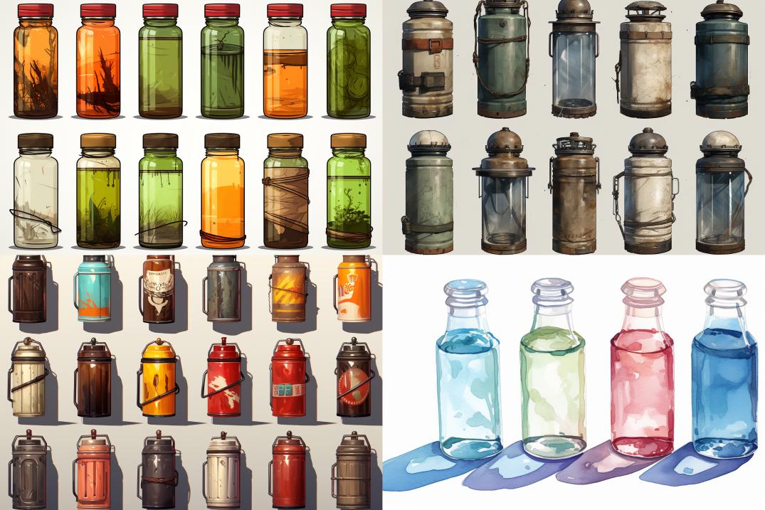 Midjourney Bot 更新时间:2023-12-17 00:06outdoor water bottles acient ,1920s,graphic design,Retro style, Watercolor, clean shadow, realistic lighting and shading, reference sheet, minimalist, Best quality, UHD, low sales, clean white background,,Mike Judge,Jean Giraud,Watercolor paint,Watercolor with ink pen outline,Gouache paint,icon set design --s 183 --c 40 --iw 1.25 --ar 3:2 --style raw --v 5.2