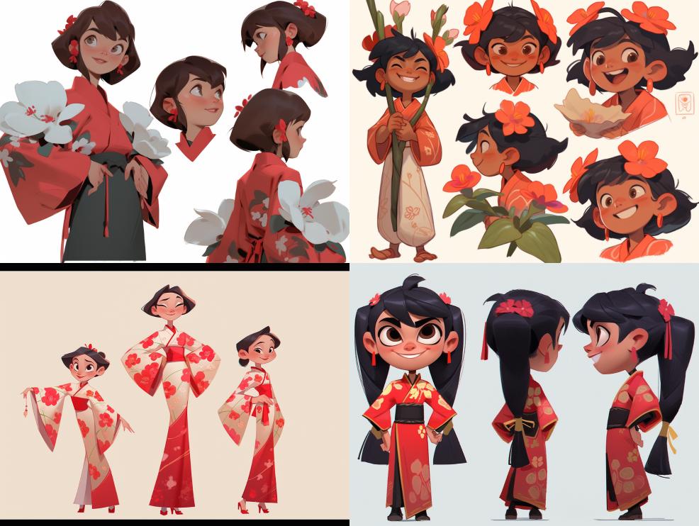Midjourney Bot 更新时间:2023-12-18 00:01A little girl in vibrant red traditional Chinese clothing stands in front of a clean background. Her three headed body displays the front, side, and back, each angle showcasing her adorable image. This picture is rich in colors and vivid in details, giving people a warm and beautiful feeling.,Hanfu,Chinese costume,Plum blossom,Bamboo,Peony,Lotus --s 440 --c 21 --ar 4:3 --style expressive --niji 5