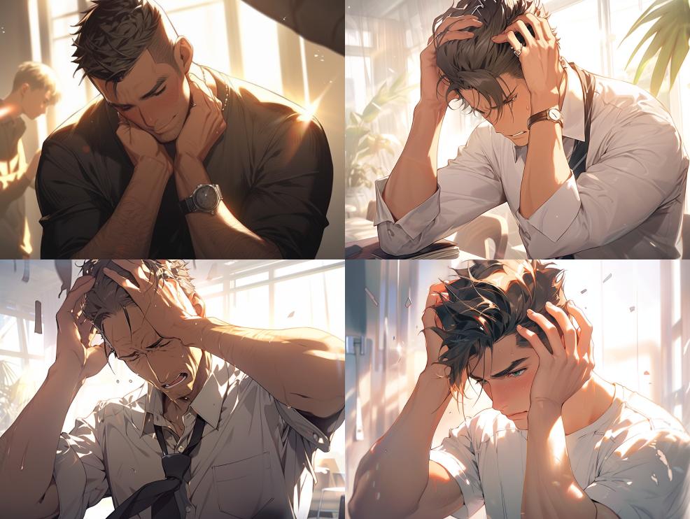 Midjourney Bot 更新时间:2023-12-18 00:01A man grabbing his head with both hands, helpless and helpless. In the afternoon, in a bright environment, the light shone through the balcony window on his body. His delicate features and makeup were warm, in a comic style, shiny and glossy. The light and shadow were of high quality, and his style was expressive. His upper body was close-up, realistic, bright, Kimi no na wa style, with meticulous facial details, sweet, bright and highly detailed. He was a master's work, 8K, high-definition --s 647 --ar 4:3 --niji 5