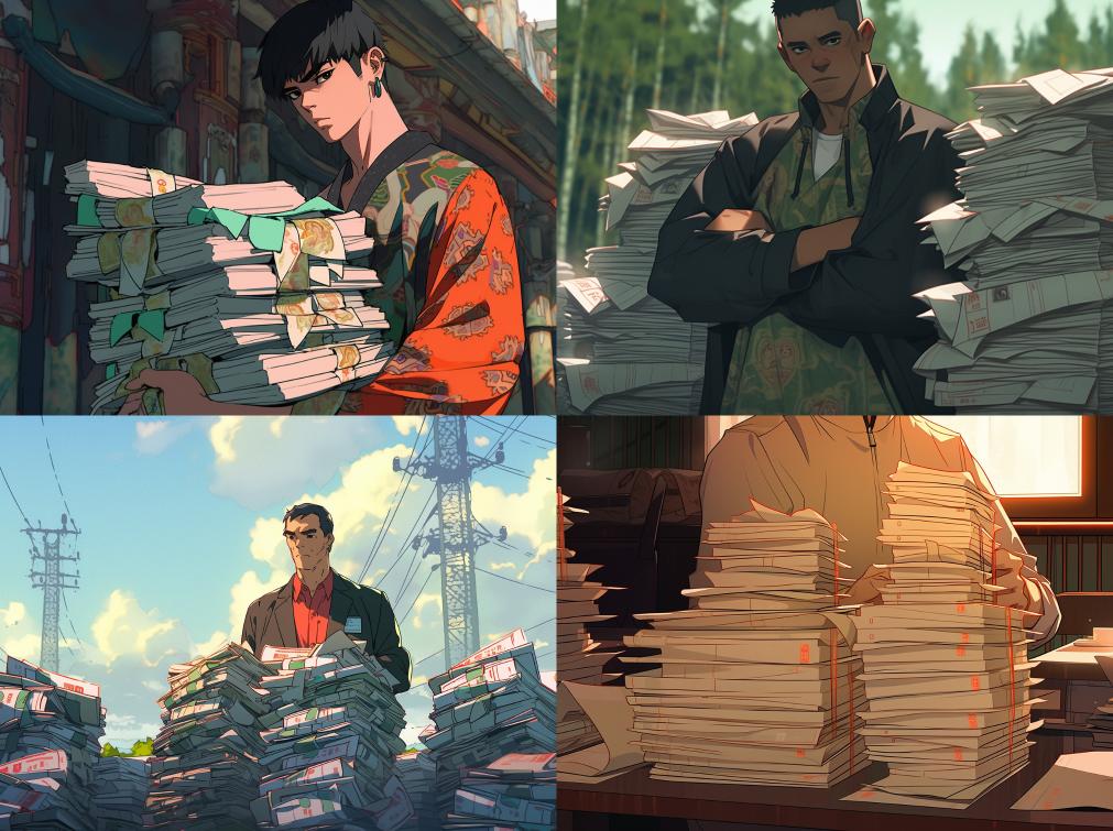Midjourney Bot 更新时间:2023-12-15 00:00Modern, a man holding a stack of bills, looking towards the camera in Chinese rural style, medium shot, UHD image --ar 128:95 --niji 5