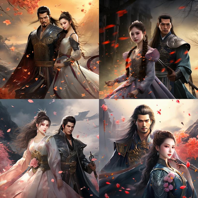 Midjourney Bot 更新时间:2023-12-15 00:01A couple, with a man in front and a woman behind, battle scenes, beautiful illustrations, vibrant colors, ancient beauty, black long hair, exquisite facial features, tied hair, peach blossom eyes, black ancient clothing, high-quality picture quality, clear wrinkles, digital painting, Chinese painting style, super detailed, complex, master, perfect technology, full body view, gemstone decoration, classical Chinese beauty, 3D rendering, high detail, super high quality, 16k wind, dynamic, landscape. --ar 1:1 --style raw --v 5.2