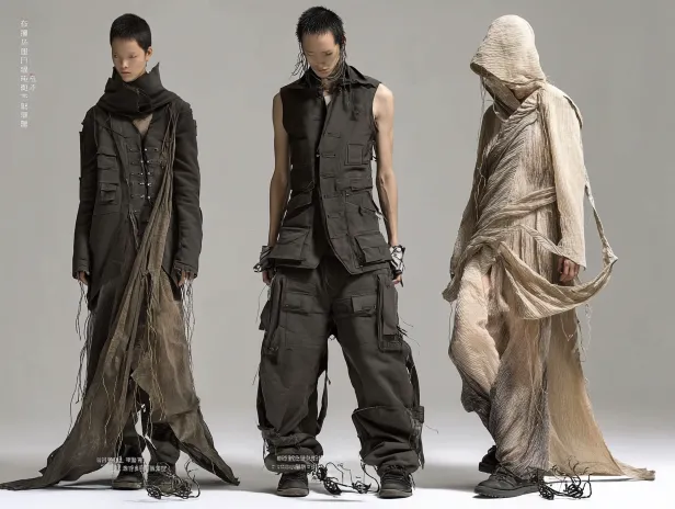 Midjourney Bot 更新时间:2026-03-29 00:07https://images.gogpt.vip/aigf/m_origin/20260328/1855210/f8b7fhp0w04cqgpp.jpg https://images.gogpt.vip/aigf/m_origin/20260327/1855210/6xdrqltm48a1lf4z.jpg https://images.gogpt.vip/aigf/m_origin/20260328/1855210/7kg0giplkn2do761.jpg https://images.gogpt.vip/aigf/origin/20260328/1774707668601753_1.png https://images.gogpt.vip/aigf/m_origin/20260327/1855210/8u6ujls70qexs1za.jpg https://images.gogpt.vip/aigf/m_origin/20260328/1855210/6p2lgtpiqeh54i2m.jpg https://images.gogpt.vip/aigf/m_origin/20260328/1855210/vg63ktfjkxezaqo4.jpg https://images.gogpt.vip/aigf/m_origin/20260328/1855210/3hf96ey50hmte3dl.jpg 一、服装廓形与特异造型 • 比例异化与雕塑感:整体打破了传统人体着装比例,通过肩线、腰线、下摆的极端处理,塑造出建筑化、雕塑化的廓形。例如第五套造型的夸张直角肩+收腰+垂坠长裙,将上半身塑造成尖锐的几何形态,形成强烈的视觉侵略性;第二套造型的无袖垂坠上衣+喇叭裤,则通过下装的极度外扩,制造出下半身的膨胀感与力量感。 • 解构重组与身体边界:多套造型采用“切割式”结构,如第三套的无袖马甲与长裙的层叠、第四套的不对称西装拼接,让身体呈现出被拆解、重组的视觉效果。服装不再是贴合身体的第二层皮肤,更像是包裹身体的防御性装置外壳,模糊了身体与衣物的边界。 • 形态延伸与装置化:第一套造型的下摆飘带、第三套的立体花卉装饰,都突破了服装的基本形态,向空间延伸,带有强烈的装置艺术特征,让服装成为身体与环境之间的媒介。 二、色彩搭配与元素符号 • 黑白灰主调+局部点缀:整体以黑白灰的高对比度色调为主,营造出冷峻、先锋的氛围;局部加入淡粉、墨绿等低饱和色彩(如头饰、装饰细节),既保留了视觉冲击力,又避免了过度艳俗,符合当代先锋时装的克制美学。 • 自然符号的异化运用: ◦ 花卉元素:第三套的立体白花、第二套与第五套的花卉头饰,将自然花卉进行抽象化、装置化处理,不再是柔美装饰,而是成为身体的面具与盔甲,象征自然与人工的对抗。 ◦ 鸟类/抽象纹样:第二套裤装的飞鸟剪影、第一套与第四套的几何暗纹,将自然形态转化为平面符号,与解构廓形形成呼应,强化了“破碎与重组”的主题。 • 面具化头部装饰:所有造型都用花卉/几何纹样覆盖面部,将头部异化为无表情的符号载体,消解了人物的个体性,让服装本身成为表达的核心,带有超现实主义的荒诞感。 三、面料特点与表现手法 • 材质冲突与层次构建: ◦ 硬挺面料:如西装面料、压纹皮革/挺括梭织,用于塑造肩线、腰线的棱角感,赋予服装建筑般的支撑力(如第四套的西装、第五套的上装)。 ◦ 柔软/半透明面料:如垂坠丝绸、网纱、蕾丝,用于营造流动感与朦胧感(如第三套的长裙、第四套的内搭蕾丝),与硬挺面料形成“刚与柔”“实与虚”的强烈对比。 • 立体装饰与平面纹样的叠加: ◦ 立体工艺:第三套的立体花卉、第一套的飘带,通过手工塑形或立体裁剪,让装饰从平面走向空间,增强服装的装置感。 ◦ 平面纹样:裤装的飞鸟剪影、衣身的几何暗纹,通过印花或提花工艺呈现,与立体装饰形成“二维与三维”的视觉碰撞,丰富了面料的叙事层次。 • 质感模拟与手绘表达:效果图通过细腻的笔触模拟了不同面料的质感——挺括面料的硬朗轮廓、丝绸的垂坠光泽、蕾丝的镂空纹理,让观者能直观感知材质差异,强化了设计的真实感与表现力。 四、整体风格与设计内核 • 风格定位:属于当代先锋实验时装,融合了解构主义、超现实主义与装置艺术思维。它不再追求传统的“美观与实用”,而是将服装视为身体的延伸与观念的载体,探讨身体、身份、自然与人工的边界。 • 主题表达:通过面具化头部、异化廓形与符号化装饰,传递出对“个体消解”“身体作为容器”的思考,既带有对传统美学的反叛,也暗含着对后现代社会中人性异化的隐喻。 • 视觉语言:黑白灰的冷峻色调、破碎重组的结构、抽象化的自然符号,共同构建出一种理性而疏离的戏剧张力,符合高定实验系列的艺术表达逻辑。 五、手绘/效果图表现 • 构图与氛围:采用横向排开的群像构图,深灰色背景突出服装主体,弱化环境干扰,让观者聚焦于造型本身。 • 线条与光影:保留了清晰的轮廓线,精准勾勒出解构廓形;通过明暗渐变模拟面料光泽与体积感,强化了服装的立体效果,同时保持了手绘的艺术质感。 • 细节刻画:对花卉、纹样、面料纹理等细节进行了细致描绘,既体现了设计的精密性,也让整体风格在先锋感之外,多了一份手工温度。 这组设计通过极致的形态异化、符号化装饰与材质冲突,完成了从“服装”到“身体装置”的转化,是当代先锋时装中极具代表性的实验性表达。 你要我帮你把这段分析压缩成一段适合参赛用的设计理念文案吗? --ar 4:3 --v 7 --stylize 100 --sref https://images.gogpt.vip/aigf/m_origin/20260328/1855210/3hf96ey50hmte3dl.jpg https://images.gogpt.vip/aigf/m_origin/20260328/1855210/6p2lgtpiqeh54i2m.jpg https://images.gogpt.vip/aigf/m_origin/20260328/1855210/7kg0giplkn2do761.jpg https://images.gogpt.vip/aigf/m_origin/20260327/1855210/6xdrqltm48a1lf4z.jpg https://images.gogpt.vip/aigf/m_origin/20260328/1855210/f8b7fhp0w04cqgpp.jpg --oref https://images.gogpt.vip/aigf/m_origin/20260327/1855210/f8f80n9wtkcmf2kp.jpg --ow 10 --sw 29