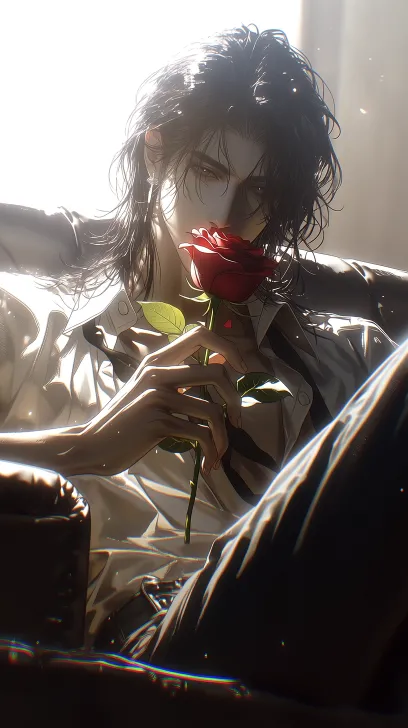 Midjourney Bot 更新时间:2026-03-29 00:12高级CG插画,大师之作,极致细节,画面主体是,一位20岁左右的现代人物,人物有黑色中长发,发丝根根分明,人物五官立体,鼻梁高挺,眼睛狭长,绝美眼睛,眼睛点缀高光,冷白皮,双腿交叠坐在沙发上人物穿着衬衫,衬衫松垮,半敞衣衫,领带微微歪斜,整体塑造出优雅、慵懒、随性的氛围,人物坐在沙发上,手中握着一朵红玫瑰,微微侧头轻吻玫瑰花瓣,动作形态慵懒,眼眸轻轻闭上看向镜头,仿佛陶醉于玫瑰的香气,温柔,室内明亮柔光,温柔的氛围感,明亮光线,光影柔和,氛围感拉满, 杰作,最佳质量,8K,超精细,CG渲染,厚涂画风,高级氛围感,细节繁复,最佳质量,超精细,高级CG,厚涂画风,柔光,弱侧光,暗部有细节,环境微光,明暗层次细腻,无过暗,无过曝,现代低奢装修,具有现代室内的氛围感,动作具有动态感,暖金色柔光,浅景深,暧昧氛围,干净现代画风,高级质感 超高清,最佳质量,16K质量,超精细,OC渲染器电影质感,景深,高分辨率,细腻肤质, 超高清,最佳质量,16K质量,超精细,OC渲染器,电影质感,景深,高分辨率,细腻肤质, --ar 9:16 --stylize 250 --niji 7