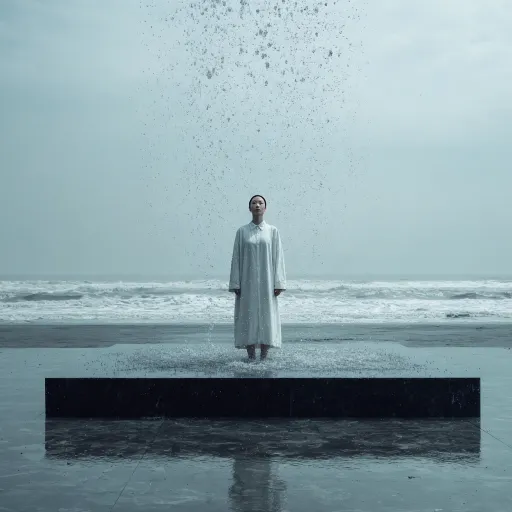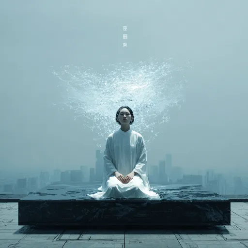 Midjourney Bot 更新时间:2026-03-29 00:23视觉符号: 纯净、未污染、水幕。 设定: 晞不是具体的“人”,而是“规律”的完美具象。她能让雨水偏转。她的服装应是绝对的冷白,与世界的铅灰形成极端对比。 提示词思路: 苍色的天空下,一个孤独的女性形象(晞)站在一个巨大的、反光的黑色平台上。她身穿简单的、近乎无瑕的白衣。雨水从四面八方落下,但在她周身一米处却自动偏转,形成一个可见的水幕穹顶,水珠在边缘飞溅。她的神情冷漠、超越,仿佛不属于这个世界。背景是广阔的、未开发的、未受污染的风景,带有赛博朋克风格的远处城市天际线。低饱和度色彩,诗意与孤寂 --ar 1:1 --v 7 --stylize 100