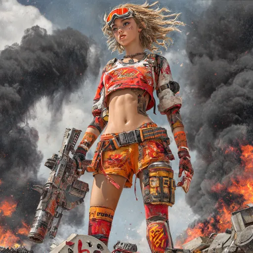 Midjourney Bot 更新时间:2026-03-29 00:23江月- “锤子与野火” (The Hammer and Wildfire) 视觉符号: 火、力量、野蛮生长、战术、压迫。 设定: 江月是晞的对立面,她是纯粹的破坏力。她的服装应是带有野火图案的战术装备,高饱和度的火红与橙色是她的核心色。 提示词思路: 江月,一个女性,眼神狂野、强势,站在一个崩塌的城市废墟上。她身穿战术装备,带有野火般的图案。她的头发被风吹得凌乱。她手里拿着一把重型的武器。她的周围是燃烧的残骸和滚滚黑烟。她的姿态是征服和破坏。高饱和度的火红与橙色,与废墟的黑灰形成鲜明对比。赛博朋克废土风格。 --ar 1:1 --v 7 --stylize 100