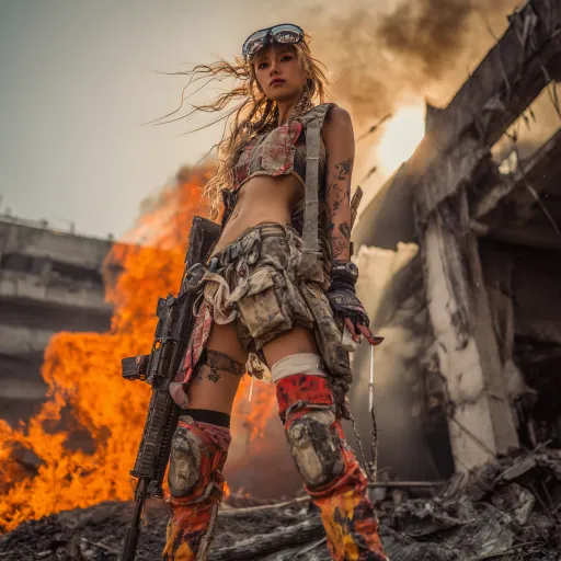Midjourney Bot 更新时间:2026-03-29 00:23江月- “锤子与野火” (The Hammer and Wildfire) 视觉符号: 火、力量、野蛮生长、战术、压迫。 设定: 江月是晞的对立面,她是纯粹的破坏力。她的服装应是带有野火图案的战术装备,高饱和度的火红与橙色是她的核心色。 提示词思路: 江月,一个女性,眼神狂野、强势,站在一个崩塌的城市废墟上。她身穿战术装备,带有野火般的图案。她的头发被风吹得凌乱。她手里拿着一把重型的武器。她的周围是燃烧的残骸和滚滚黑烟。她的姿态是征服和破坏。高饱和度的火红与橙色,与废墟的黑灰形成鲜明对比。 --ar 1:1 --v 7 --stylize 100