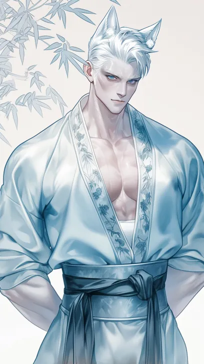 Midjourney Bot 更新时间:2026-03-29 00:26一个俊美动漫男人,穿着唐代传统服饰,冷白如玉的肌肤,冷白皮,珠光水润皮肤,宽肩细腰,宽胸,胸肌,倒三角身材,鲨鱼三角肌,九头身 身材,顶着白色毛茸茸的狐狸耳朵,穿着淡青色的竹绣绸袍,白色的内衫,头发湿漉漉的,黑暗漫画,动漫插画 --ar 9:16 --stylize 100 --niji 6 --no no