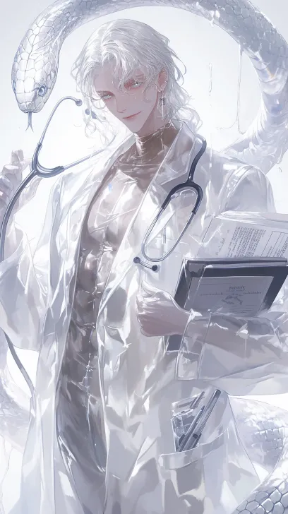 Midjourney Bot 更新时间:2026-03-29 00:28一个俊美动漫男人,男人motiefed snake,蛇鳞,丝绸,白色,金属质感鳞片了,淡色,透明感肌,对比白蓝,冷白皮,宽肩细腰,宽胸,倒三角身材,白发,穿着白色乳胶材质白大褂,听诊器,病历本,头发湿漉漉的,磨砂玻璃,水蒸气,动漫美学,黑暗漫画,a --ar 9:16 --stylize 100 --niji 6 --no no