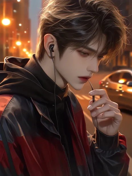 Midjourney Bot 更新时间:2026-03-29 00:31一个男孩,年轻气质,清凉白皙的皮肤,精致的五官,随机色头发,浅棕色眼睛,浓密的睫毛,耳钉,精致妆容,穿着黑红相间的工装夹克,里面有黑色高领底层,时髦街头风格,清爽青春气质,富有少爷气场,街头风格摄影,狼尾发型,BJD娃娃质地, 半身构图剪裁至胸部,戴着耳机低头,侧脸向下,手指玩弄耳机线,背景是黄昏时分的城市街道,温暖的橙色路灯开始发光,模糊的汽车经过,温馨的都市氛围,轻松且时尚的街头照 --ar 3:4 --stylize 450 --niji 7