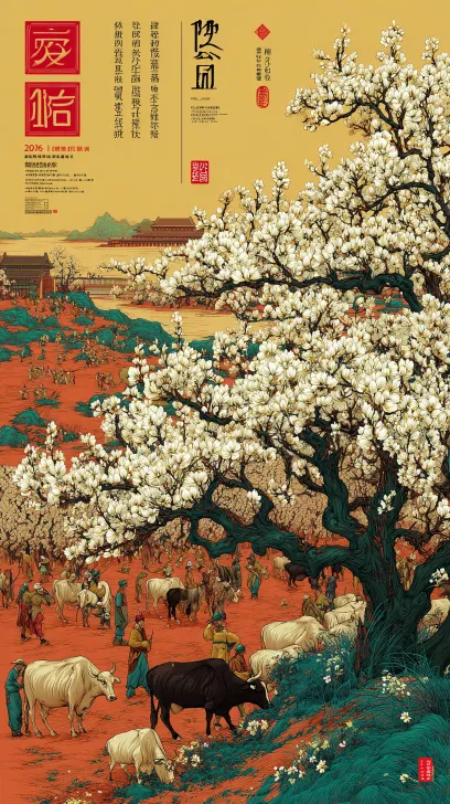 Midjourney Bot 更新时间:2026-03-29 00:32请生成一幅中国农民画风格的插画,主题为“江北水城·聊城梨园春”。画面需包含以下元素: 前景:大片盛开的梨树,花朵洁白,枝干用粗黑线条勾勒,形态夸张;树下是平原地形,无山脉;加入鲁西黄牛在树下吃草,或农民正在给梨树授粉、修剪枝条。 中景:光岳楼的剪影,或京杭大运河的船只;体现“平原”特征,地平线平直开阔。 背景:可加入现代元素,如骑行的人群、现代商业街区,或传统岭南民居与现代高楼并存。 风格与氛围:色彩高饱和度(大红、大绿、明黄、艳蓝),对比强烈;构图饱满、热闹,不留大面积空白;无视透视关系,具有装饰性;整体氛围喜庆、丰收、生机勃勃。 进阶技巧 色彩控制:使用“高饱和度”、“对比强烈”等词,避免AI生成写实照片。 构图控制:强调“构图饱满”、“不留大面积空白”,确保画面热闹。 地域特征:明确提及“光岳楼”、“京杭大运河”、“鲁西黄牛”等聊城特有元素,避免AI生成通用果园。 --ar 9:16 --v 7 --stylize 100