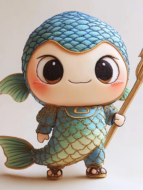 Midjourney Bot 更新时间:2026-03-29 00:36https://images.gogpt.vip/aigf/m_origin/20260329/2104938/765u6ih6shdyfmn3.jpg https://images.gogpt.vip/aigf/m_origin/20260326/2104938/jzadwiw30iw9s3u2.JPG 奔波儿灞,西游记中的鱼精,Q版,平面感强,绣在布上,大头小身体,圆圆鱼头,鱼鳞纹,大眼睛,表情狡黠机灵,身穿鱼鳞小铠甲,手持三叉戟,站立姿态。汉绣风格:蓝色与绿色为主色,鱼鳞纹用铺针绣表现,衣边有浪花纹,钉线锁边,满绣铺陈,背景有水波纹和浪花装饰,平面感强,无立体光影,刺绣丝线纹理清晰可见,民间绣品风格。 --ar 3:4 --v 6.1 --style raw --stylize 500 --sref https://images.gogpt.vip/aigf/m_origin/20260326/2104938/jzadwiw30iw9s3u2.JPG https://images.gogpt.vip/aigf/m_origin/20260326/2104938/ltuc2cvxhjsd7whi.jpg https://images.gogpt.vip/aigf/m_origin/20260326/2104938/h90nrgd44nkaf91j.jpg --cref https://images.gogpt.vip/aigf/m_origin/20260329/2104938/765u6ih6shdyfmn3.jpg --cw 100 --sw 500 --no 红色