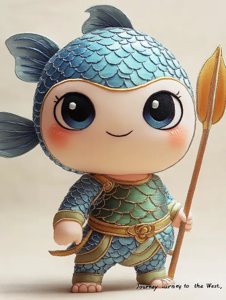 Midjourney Bot 更新时间:2026-03-29 00:34https://images.gogpt.vip/aigf/m_origin/20260329/2104938/765u6ih6shdyfmn3.jpg https://images.gogpt.vip/aigf/m_origin/20260326/2104938/jzadwiw30iw9s3u2.JPG 奔波儿灞,西游记中的鱼精,Q版,大头小身体,圆圆鱼头,鱼鳞纹,大眼睛,表情狡黠机灵,身穿鱼鳞小铠甲,手持三叉戟,站立姿态。汉绣风格:蓝色与绿色为主色,鱼鳞纹用铺针绣表现,衣边有浪花纹,钉线锁边,满绣铺陈,背景有水波纹和浪花装饰,平面感强,无立体光影,刺绣丝线纹理清晰可见,民间绣品风格。 --ar 3:4 --v 6.1 --style raw --stylize 500 --sref https://images.gogpt.vip/aigf/m_origin/20260326/2104938/jzadwiw30iw9s3u2.JPG https://images.gogpt.vip/aigf/m_origin/20260326/2104938/ltuc2cvxhjsd7whi.jpg https://images.gogpt.vip/aigf/m_origin/20260326/2104938/h90nrgd44nkaf91j.jpg --cref https://images.gogpt.vip/aigf/m_origin/20260329/2104938/765u6ih6shdyfmn3.jpg --cw 100 --sw 500 --no 红色