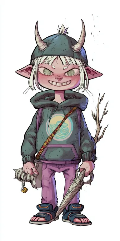 Midjourney Bot 更新时间:2026-03-27 00:16https://images.gogpt.vip/aigf/m_origin/20260327/2040192/mjgv17758zpiefw9.jpg 一个充满个性的小鬼角色,拥有尖耳朵和独特的发型,头戴带角的帽子。身穿深色连帽衫,上面印有波浪图案,搭配舒适的裤子和凉鞋。手中握着一根奇特的武器,旁边还有一根干枯的树枝,增添了自然元素。整体风格生动,具有卡通感,展现出一种奇幻和冒险的气息。动画2d任务形象图,浮世绘风格,纯白背景 --ar 1:2 --v 7 --stylize 100 --iw 1.5 --sref https://images.gogpt.vip/aigf/m_origin/20260326/2040192/4k11i1uflgiphmw5.jpg https://images.gogpt.vip/aigf/m_origin/20260327/2040192/186q0osokv02k1cm.jpg https://images.gogpt.vip/aigf/m_origin/20260327/2040192/0b5bs2ny084ezktl.jpg --oref https://images.gogpt.vip/aigf/m_origin/20260326/2040192/4k11i1uflgiphmw5.jpg --ow 291 --no 背景、文字
