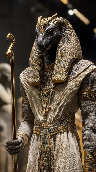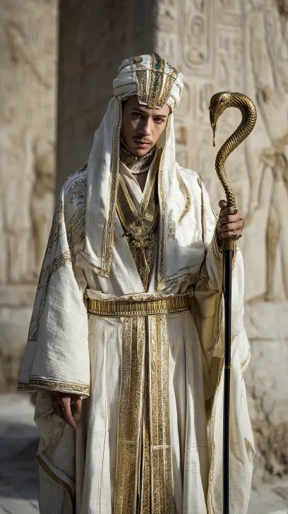 Midjourney Bot 更新时间:2026-03-27 00:17古埃及神庙最高统治者,大祭司,fullbody,25岁男性,中东与白人混血人,英俊清秀的五官,身形挺拔清瘦,纯白金线刺绣亚麻长袍,一尘不染,沉重华丽的黄金绿松石项圈,蛇头权杖,微眯双眼,下巴高傲抬起,嘲弄神情,精于算计的紧张感,绝对神权垄断者,神圣威严,古埃及神庙背景,电影级光影,超高清细节 --ar 9:16 --v 7 --style raw