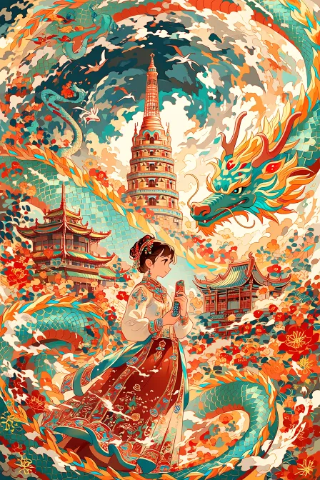 Midjourney Bot 更新时间:2026-03-27 00:19这幅插图充满了色彩和细节,展现了中国传统文化的元素。画面中有一位女性,身穿华丽的民族服饰,手中握着一个物件,展现出优雅与自信。背景中有一座古塔,周围环绕着腾飞的龙和五彩斑斓的云彩,象征着力量与吉祥。 图案中还融入了花卉和白鹤等自然元素,增添了生动的气息。画面的色彩丰富,鲜艳的红、绿、蓝相互交织,形成了一种热烈而和谐的视觉效果。整体风格展现了浓厚的民族特色与艺术魅力。 --ar 2:3 --stylize 250 --niji 7 --no color,shading