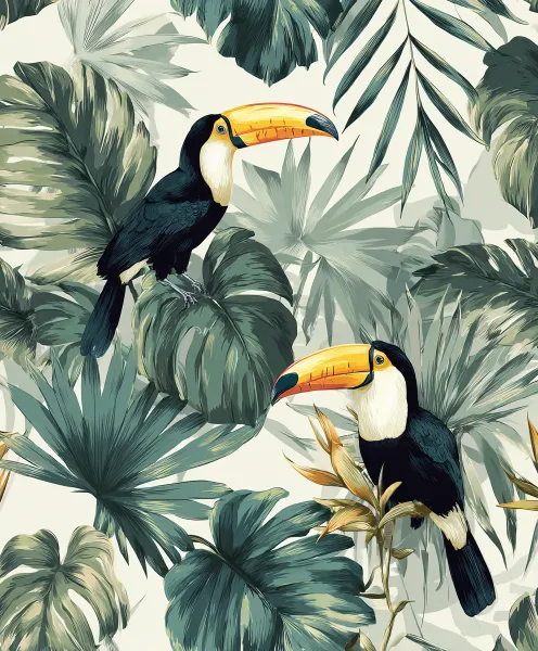 Midjourney Bot 更新时间:2026-03-27 00:20• 图案:以巨嘴鸟(鵎鵼)和热带植物(龟背竹、棕榈叶)为核心元素,在白色底布上随机错落排布,形成清新自然的无缝印花纹样。 • 色彩:以白色为底色,搭配深绿、浅绿的叶片,黑色的巨嘴鸟身体和醒目的橙黄色鸟喙,整体色调清新柔和,充满夏日感。 • 风格:扁平矢量插画风格,线条干净清晰,图案简约可爱,兼具休闲与度假感。 --ar 5:6 --v 7 --stylize 100