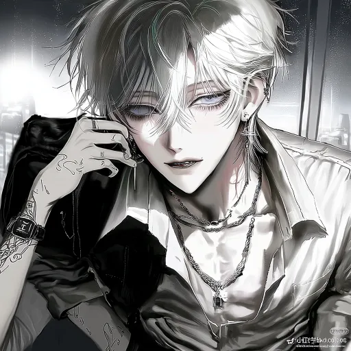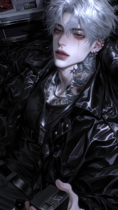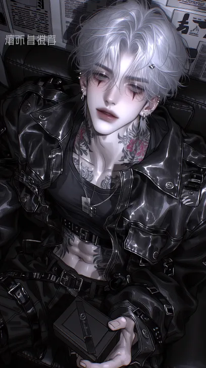 Midjourney Bot 更新时间:2026-03-27 00:232.5D伪厚涂+插画风格 一个帅气的男性boy 少年感 小麦色皮肤 五官精致 白色短发+狼尾微卷 刘海呈现“M”字 黑色眼睛 男人看起来桀骜不驯 带着银色耳钉 高鼻梁 睫毛根根分明 非常帅气 少年身穿黑色皮质夹克(拉链拉至胸口部位 呈现锁骨)+内搭黑色运动背心+黑色宽松设计感工装裤+黑色皮带 男人身材非常好 模特九头身 肌肉线条流畅 肌肉发达 带着银色细款项链(金属反光质感) 少年看向镜头 背景在纹身店内(灰暗亚文化风格+墙上海报)少年脸上有一道浅色长疤痕 花色纹身(脖子、胸口、双臂) 男人靠在墙上 一只手撑着沙发另一只手拿着黑色盒子(盒子巴掌大小) 鱼眼镜头融合鸟瞰视角 男人微微仰头 形成强烈的视觉效果 光影渲染 极致的细节处理 丰富的元素 高饱和 鲜艳的色彩 细腻磨砂质感笔触 中景 面部特写 笑不露齿 成熟感男性 --ar 9:16 --stylize 200 --niji 7 --profile fg2j9c8