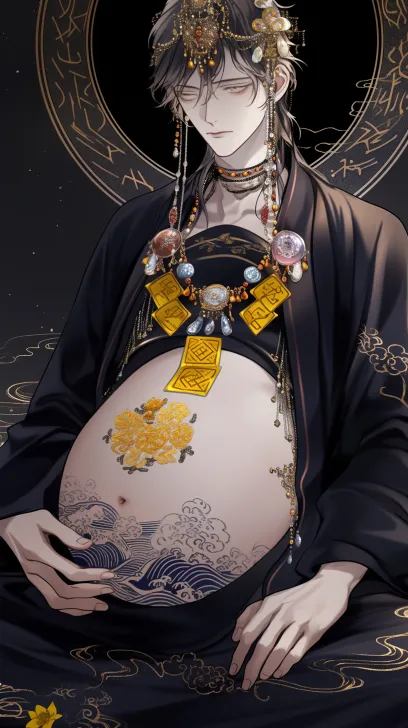 Midjourney Bot 更新时间:2026-03-27 00:23动漫插画,一个俊美动漫男人,怀孕,冷白皮,宽肩细腰,倒三角身材,宽胸 身材挺拔,坐姿端正,宽臀,坐在地上,黑发,玛瑙和珐琅饰 (中间有一朵金线编制的花朵、珐琅彩和金色,配以小花、珊瑚珠和宝石,带有金色云纹,镶嵌着珍珠,形状为黑色背景上的拱形)刺绣乌沙幞头,穿着藏蓝色汉服,衣领敞开,衣襟/袖口有水波纹刺绣,长方形黄色runes,胸口有许多六芒星图形和图腾图案纹身贴膜,高品质,8K,线条流畅 --ar 9:16 --style raw --stylize 100 --niji 6 --no no